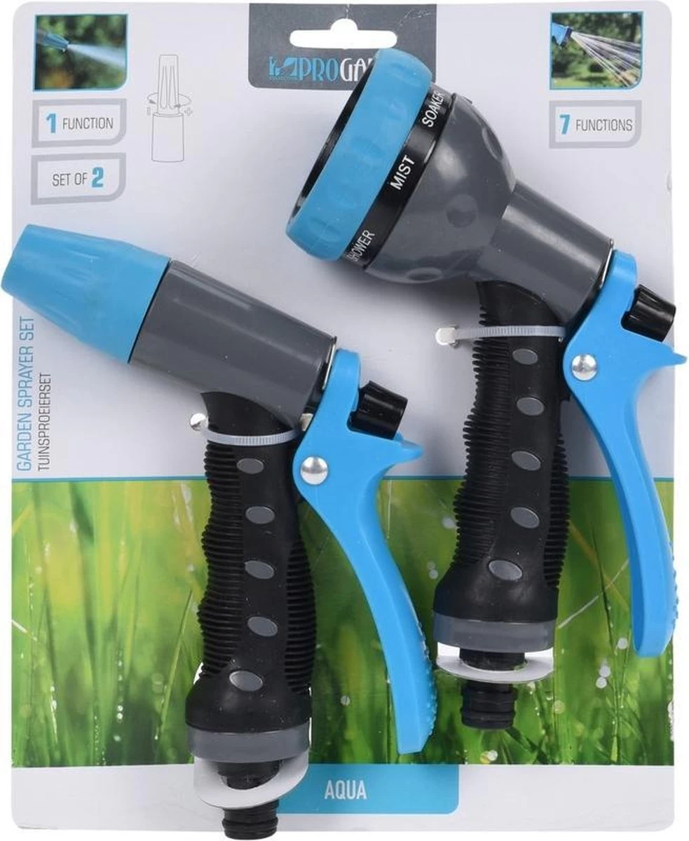 Een set met 2 anti-slip tuinslang sproeipistolen/spuitpistolen/sproeikoppen. De set bevat een sproeikop met straalsysteem met Jet-instensiteitsinstelling en een spuitpistool met zeven verschillende functies waaronder nevel. Kleur: blauw/grijs. Materiaal: kunststof. Tuinier/tuin artikelen accessoires en benodigdheden.