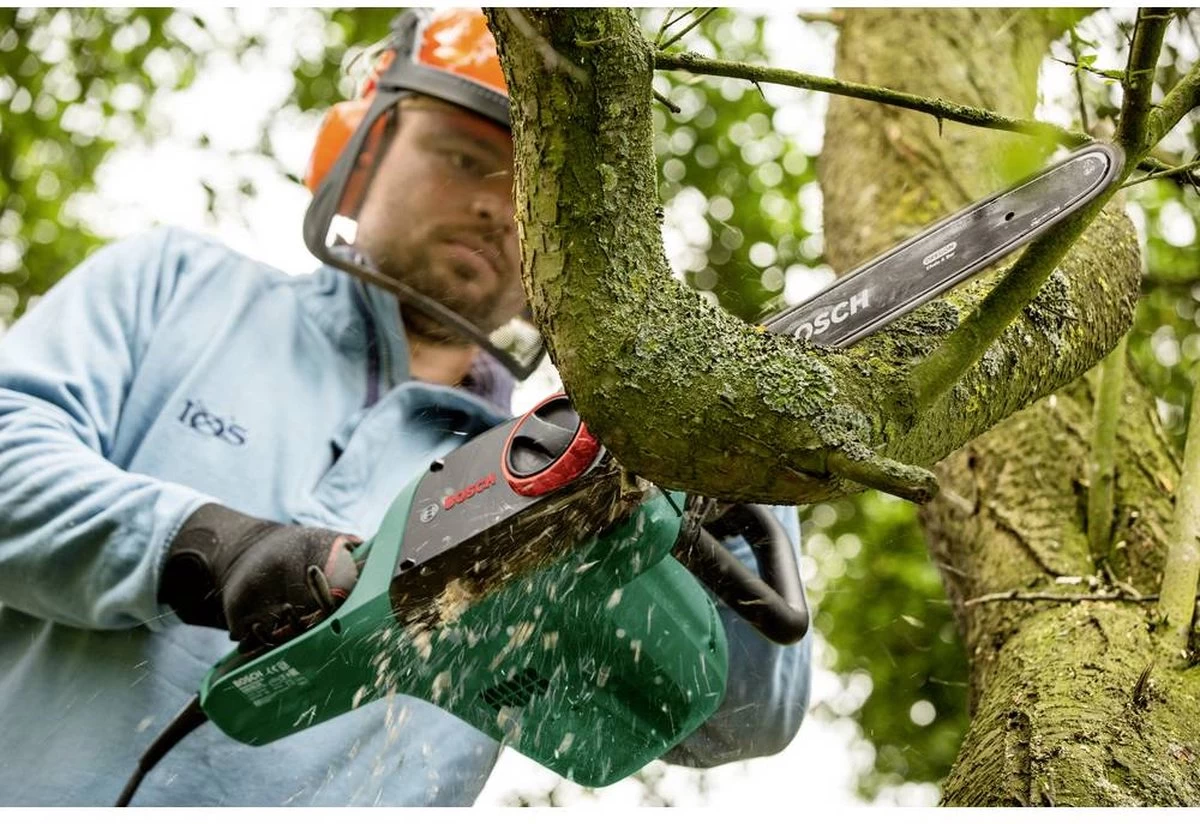 De Bosch UniversalChain 35 kettingzaag met snoer, licht met een gewicht van 4,2 kg en ergonomisch ontworpen voor maximaal gebruikersgemak. Een krachtige motor van 1800 W met een kettingsnelheid van 12 m/s zorgt voor snelle zaagprestaties. Het compacte Bosch SDS-systeem maakt het mogelijk om de ketting zonder extra gereedschap en eenvoudig te spannen en onderhouden. Een groot oliereservoir aan de zijkant met een handige dop met bandje garandeert gemakkelijk bijvullen van het automatische kettingsmeersysteem. Een robuuste terugslagrem garandeert een volledige kettingstop voor veiligheid. Deze kettingzaag is gemakkelijk te gebruiken en wendbaar, zodat hij ideaal is voor het zagen van houtblokken, takken en kleine tot middelgrote bomen.