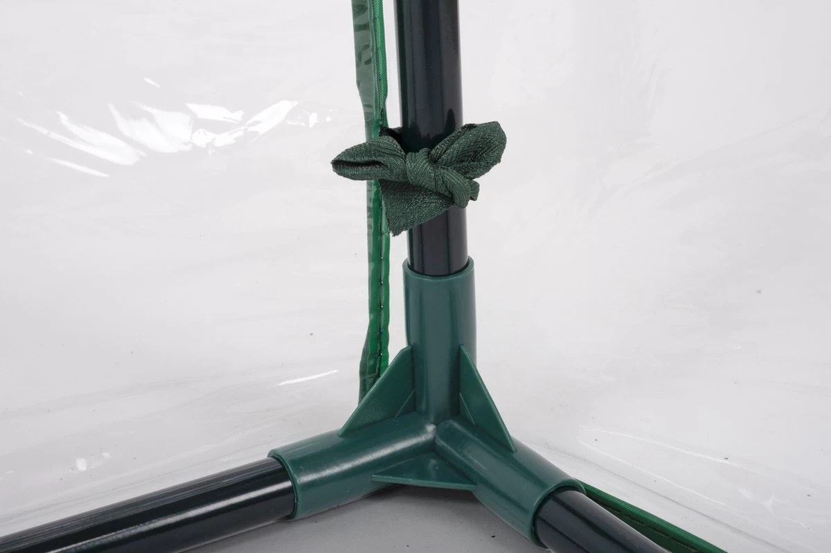 Deze tuinkas is een zogenaamde tunnelkas van circa 130 centimeter lang, 50 centimeter breed en een hoogte van ongeveer 60 centimeter. De kas heeft geen bodem; je zet hem direct op de aarde waar je gewassen staan. De doorschijnende folie benut optimaal de warmte en het licht van de zon, waardoor je een microklimaat creëert met een goede temperatuur en vochtigheid. De folie beschermt je planten tegen schadelijke insecten en weersinvloeden, zoals wind en regen. Aan beide uiteinden van de foliekas zit een rits, zodat je de folie goed kan openen om bijvoorbeeld je planten water te geven. De opgerolde folie kun je met lintjes vastzetten. Zo laat je de zaailingen ook afharden, waardoor ze wennen aan de temperatuur buiten de kas.