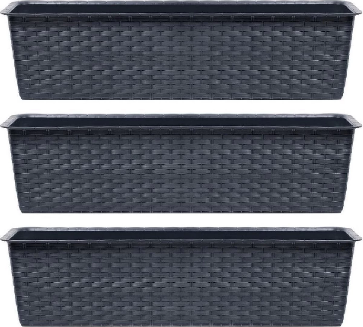 4x Ratolla rotan plantenbak/bloembak antraciet 6.3 liter. Kras en stootvaste bloembak/plantenbak met rotanvlechtwerk uitstraling. Voorzien van een onderzetter met sluitsysteem. Zonder afwateringsgaten. De bloembakken/plantenbakken zijn geschikt voor binnen en buiten gebruik. Serie: ratolla case. Formaat: lengte ca 39,1 cm. Breedte: ca 17,3 cm. Hoogte: ca 14,5 cm. Inhoud: 6,3 liter.