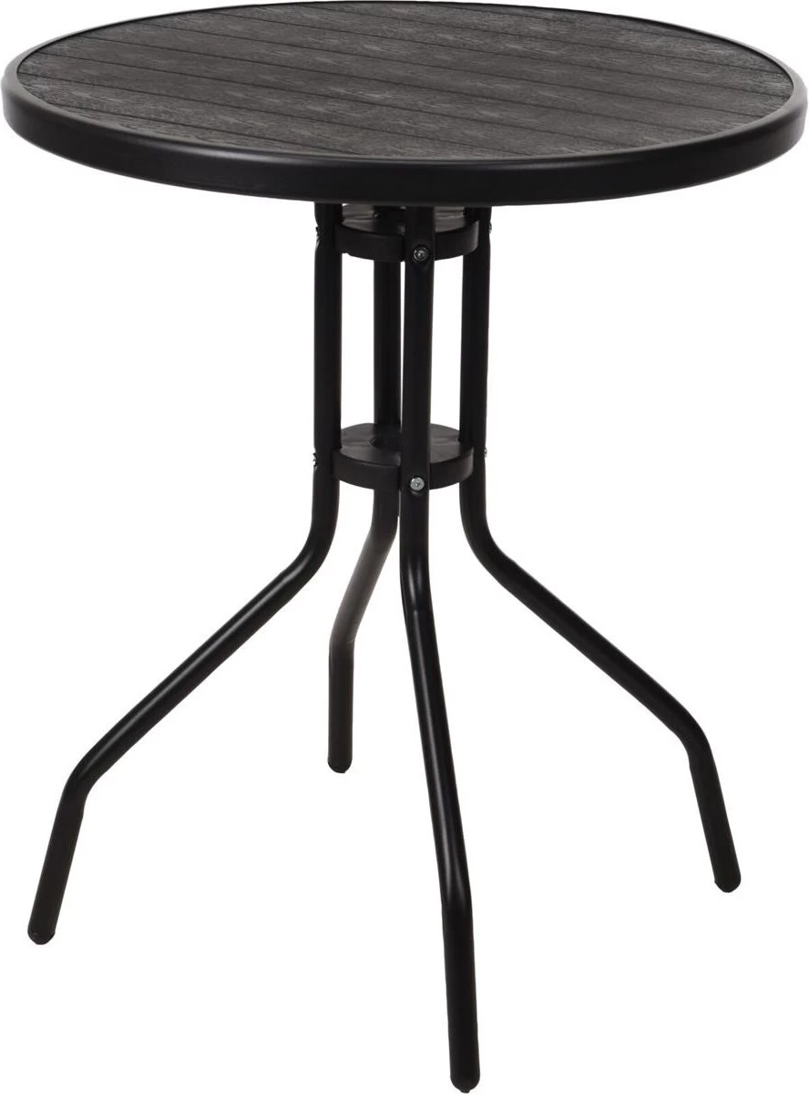 Deze ronde tuintafel heeft een zeer solide gepoedercoat metalen frame. Het onderhoudsvriendelijke tafelblad is gemaakt van robuust massief kunststof met een houten structuur en is ideaal voor gebruik binnen en buiten.