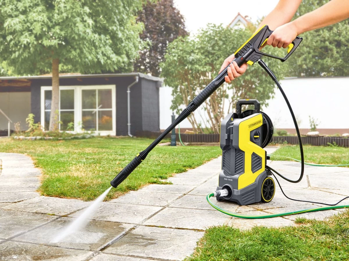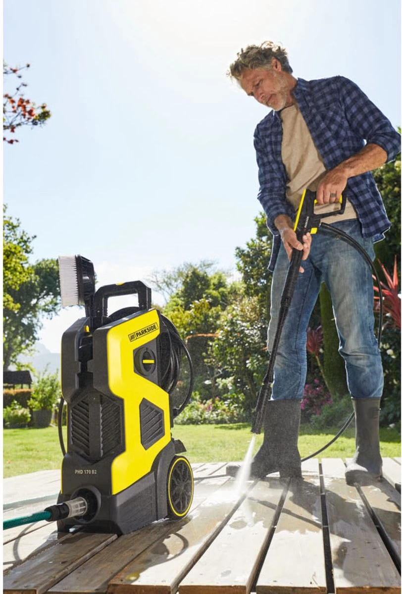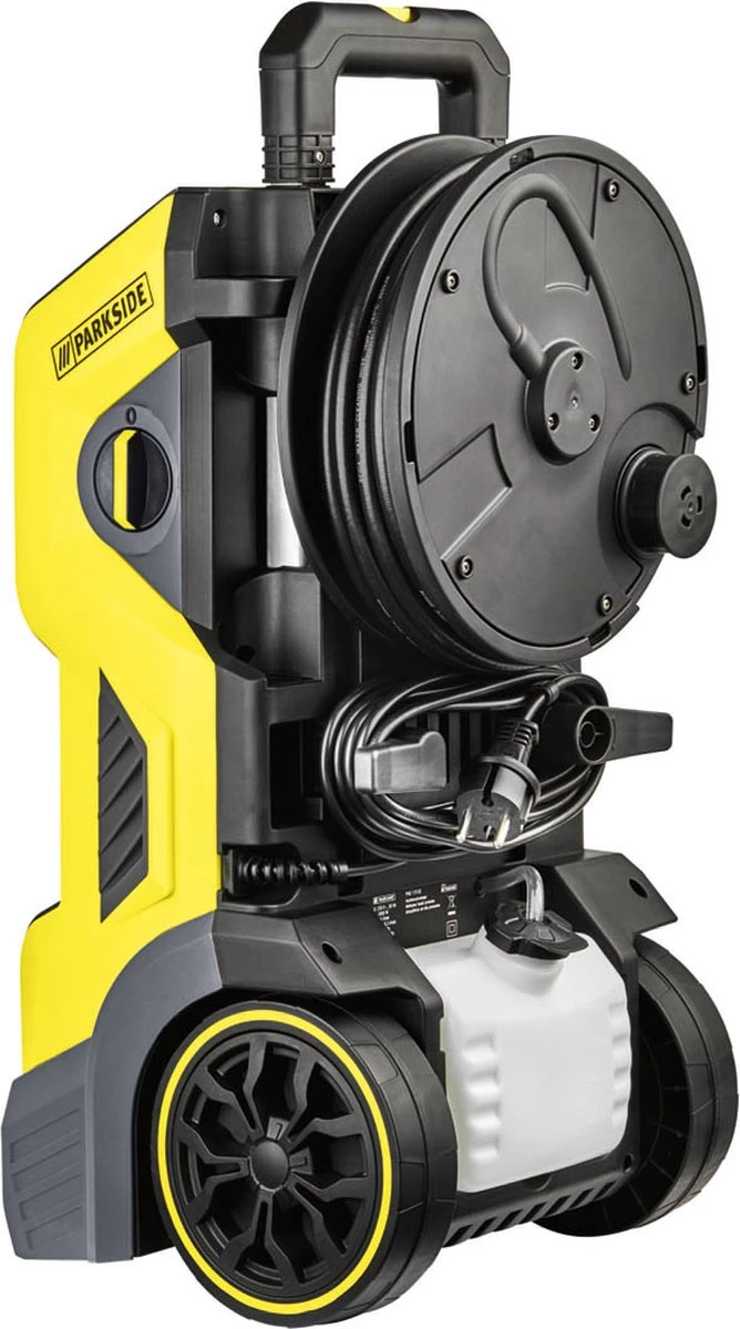 Inclusief 1 pistoolgreep, 1 standaard variabele spuitkop, 1 turbo-vuilfrees, 1 roterende wasborstel met knikscharnier, 1 reinigingsnaald voor sproeikop, 1 wateraansluiting met zeefinzetstuk, 1 snelaansluiting met tuinslangadapter, 10 meter lange hogedrukslang en 1 fles reinigingsmiddel (500 ml)
